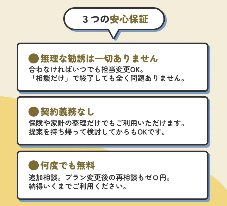 単なる保険商品の紹介だけでなく、あなたの人生設計に合わせた最適な保険プランを提案できます。