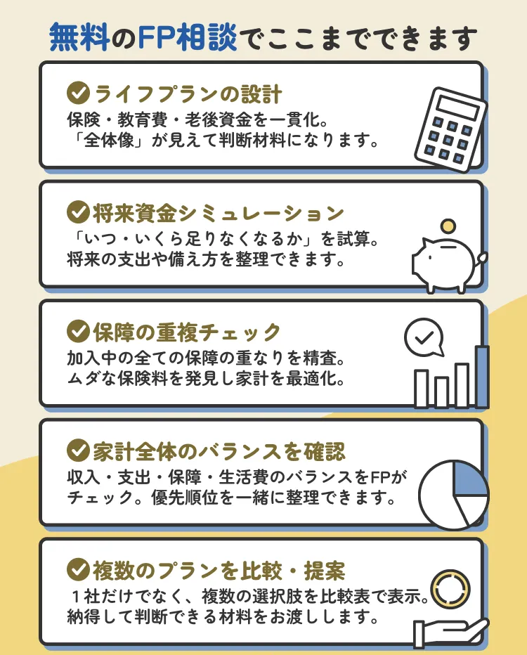 保険だけでなく教育費や老後資金も考慮したトータルな家計へのアドバイスが期待できます。